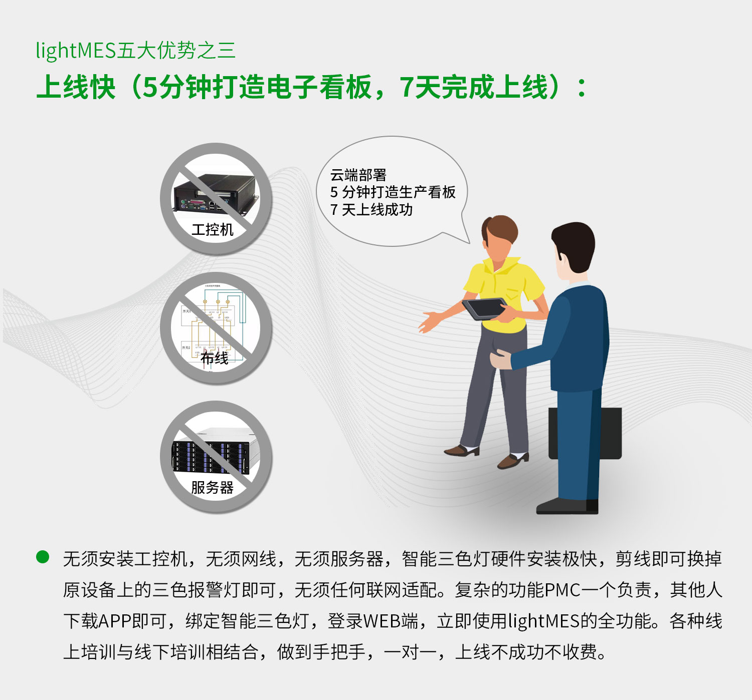 機(jī)床管家云MES管理系統(tǒng)優(yōu)勢,上線快,5分鐘打造電子看板,7天完成上線。